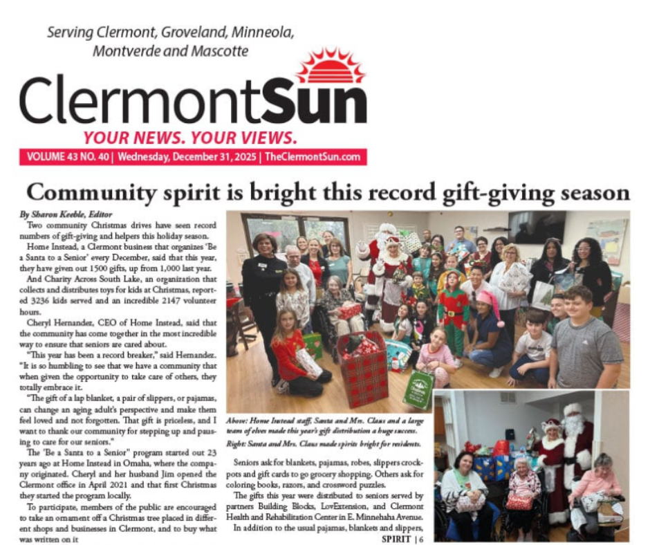 The event’s impact didn’t go unnoticed — Home Instead, Clermont efforts were proudly featured in the Clermont Sun Newspaper, showcasing how neighbors came together to support aging adults in our community. Local coverage celebrated the increase in participation and highlighted the joy these thoughtful gifts brought to seniors throughout Clermont.